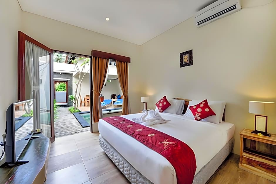 This villa features a private pool, an open plan seating and dining area, an air-conditioned bedroom and an private bathroom.